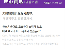 | 明心寶鑑(명심보감) 天理篇(천리편) 005. 天聽寂無音(천청적무음) 蒼蒼何處尋(창창하처심). (0) | 2019.09.03 |