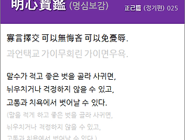 | 明心寶鑑(명심보감) 正己篇(정기편) 025. 寡言擇交(과언택교) 可以無悔吝(가이무회린) 可以免憂辱(가이면우욕). (0) | 2018.04.28 |