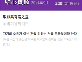 定心應物 雖不讀書 可以爲有德君子. 정심응물 수부독서 가이위유덕군자. 마음을 가라앉히고 만물(萬物)을 대(對)한다면, 비록 책(冊)을 읽지 않았더라도, 덕(德)을 갖춘 군자(君子)라고 생각할 수 있다. (안정(安定)된 마음으로 만물(萬物)을 대(對)한다면, 비록 배우지 못하였더라도, 덕(德)을 갖춘 군자(君子)라고 할 수 있다.)