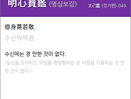 ■定心應物 雖不讀書 可以爲有德君子. ■정심응물 수부독서 가이위유덕군자. ■마음을 가라앉히고 만물(萬物)을 대(對)한다면, 비록 책(冊)을 읽지 않았더라도, 덕(德)을 갖춘 군자(君子)라고 생각할 수 있다. (안정(安定)된 마음으로 만물(萬物)을 대(對)한다면, 비록 배우지 못하였더라도, 덕(德)을 갖춘 군자(君子)라고 할 수 있다.)