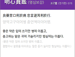 | 明心寶鑑(명심보감) 正己篇(정기편) 078. 良藥苦口利於病(양약고구이어병) 忠言逆耳利於行(충언역이이어행). (0) | 2018.06.20 |
