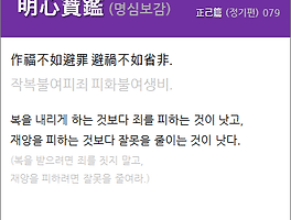 | 明心寶鑑(명심보감) 正己篇(정기편) 079. 作福不如避罪(작복불여피죄) 避禍不如省非(피화불여성비). (0) | 2018.06.21 |