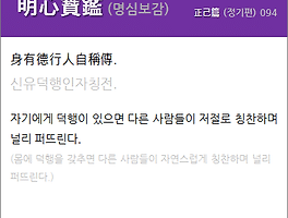 | 明心寶鑑(명심보감) 正己篇(정기편) 094. 身有德行人自稱傳(신유덕행인자칭전). (0) | 2018.07.06 |