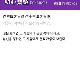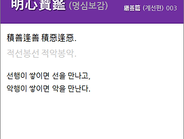 | 明心寶鑑(명심보감) 繼善篇(계선편) 003. 積善逢善(적선봉선) 積惡逢惡(적악봉악). (0) | 2019.07.19 |