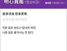 | 明心寶鑑(명심보감) 繼善篇(계선편) 006. 一日不念善(일일불념선) 諸惡自皆起(제악자개기). (0) | 2019.07.22 |