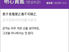 | 明心寶鑑(명심보감) 繼善篇(계선편) 014. 君子見毫厘之善不可傾之(군자견호리지선불가경지). (0) | 2019.07.30 |