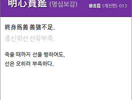 | 明心寶鑑(명심보감) 繼善篇(계선편) 013. 終身爲善(종신위선) 善猶不足(선유부족). (0) | 2019.07.29 |